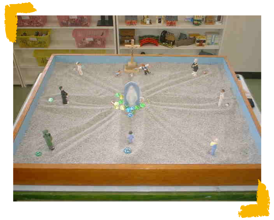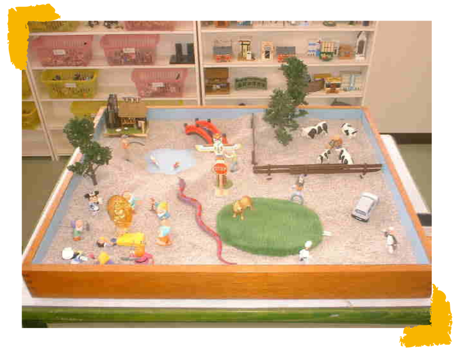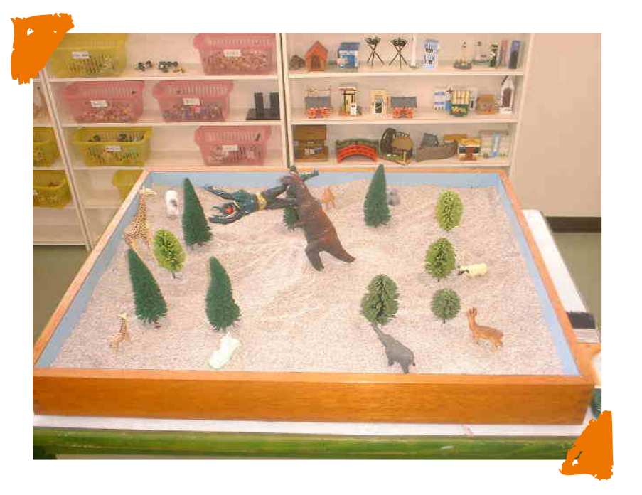 箱庭療法では、砂の入った箱の中に人や動物や乗り物、植物などのミニチュアを自由に並べて箱庭を作ります。