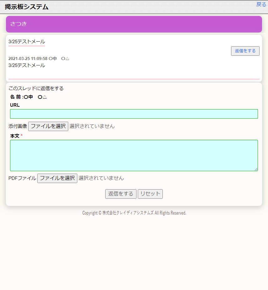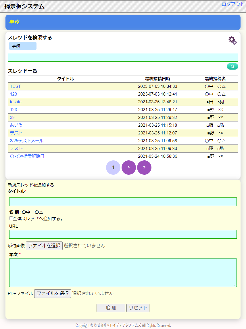 職員の情報共有する場として用意しました。PDFや写真の添付が可能なので、文字入力以外で送付された資料や文字以外で説明したい場合に便利です。