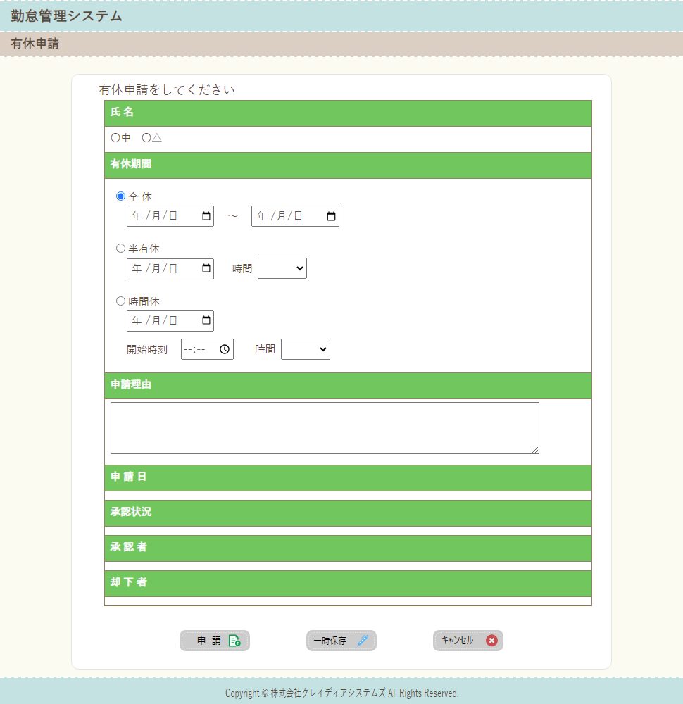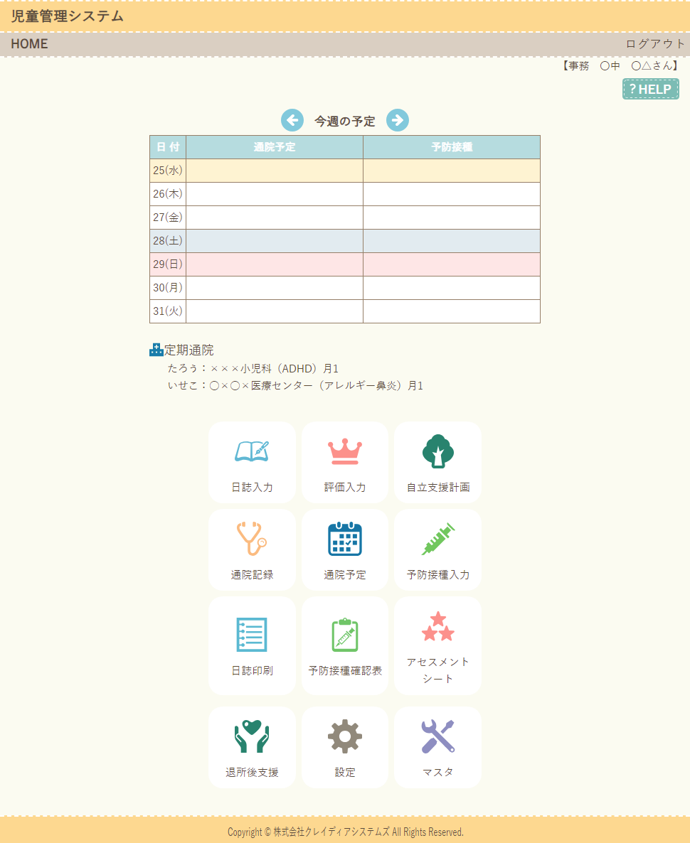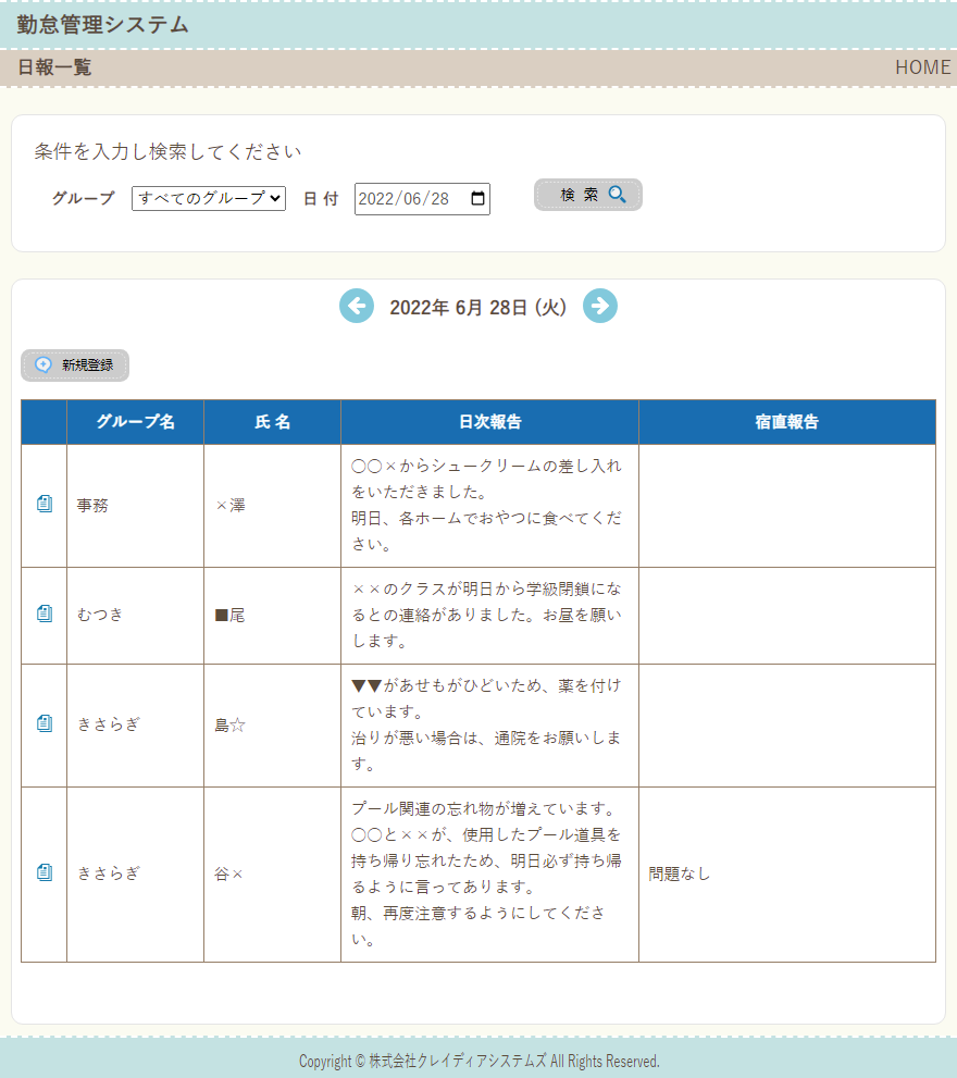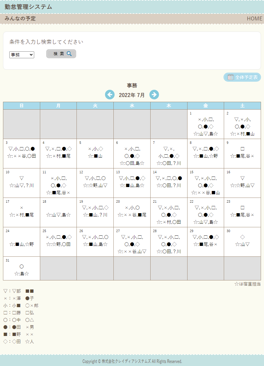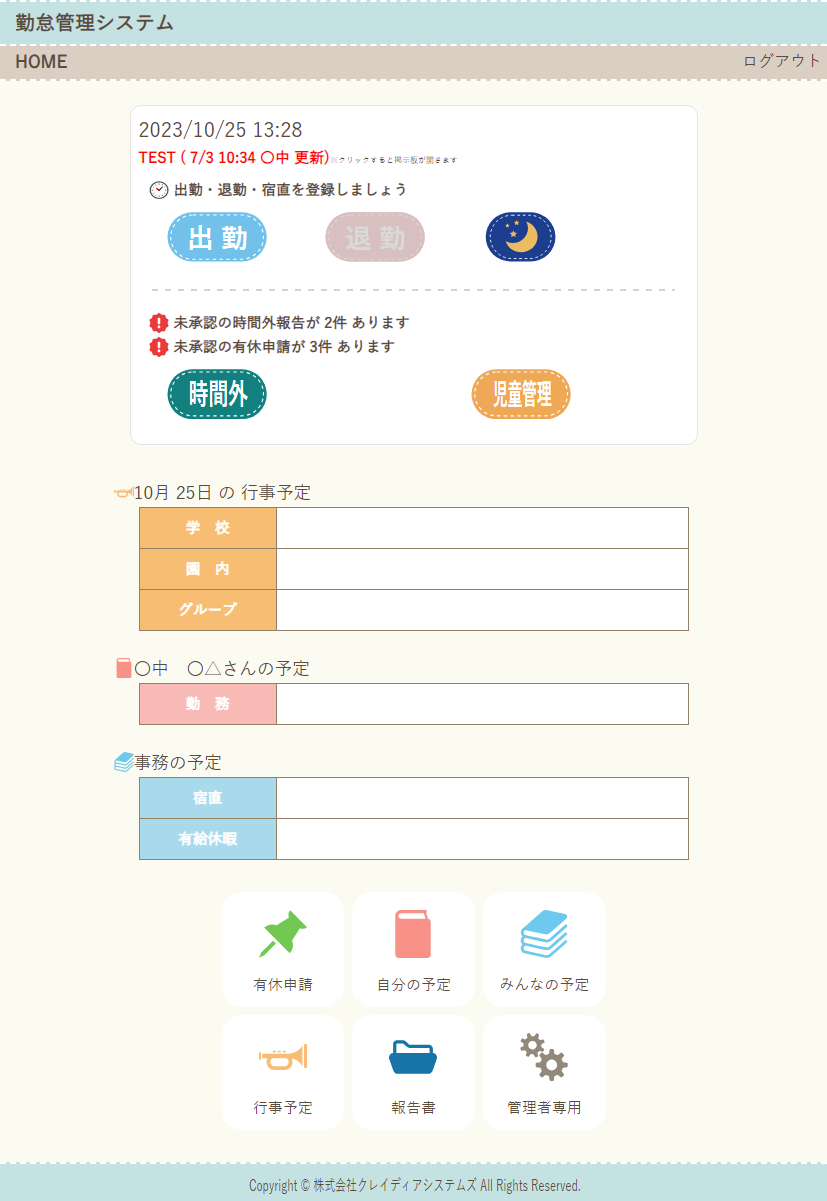 シフト・勤怠の登録がメインとなるシステムです。ほかに行事予定や日報も登録できます。